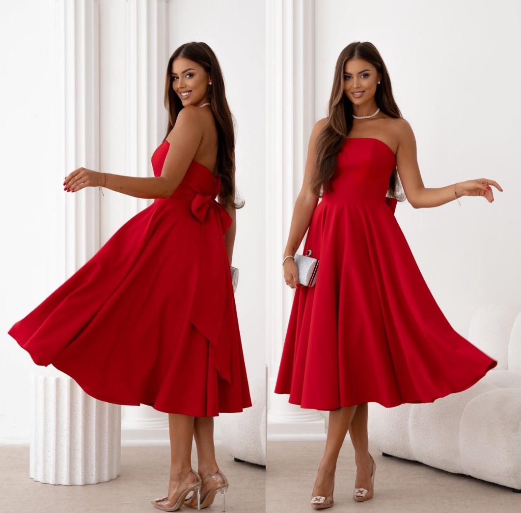 Rozkloszowany dół o długości midi układa się efektownie podczas ruchu, tworząc harmonijną i niezwykle kobiecą formę. Z tyłu sukienki znajduje się ozdobna kokarda, która stanowi elegancki akcent i dodaje całości romantycznego charakteru. Zapięcie na kryty zamek zapewnia komfort noszenia oraz idealne dopasowanie.