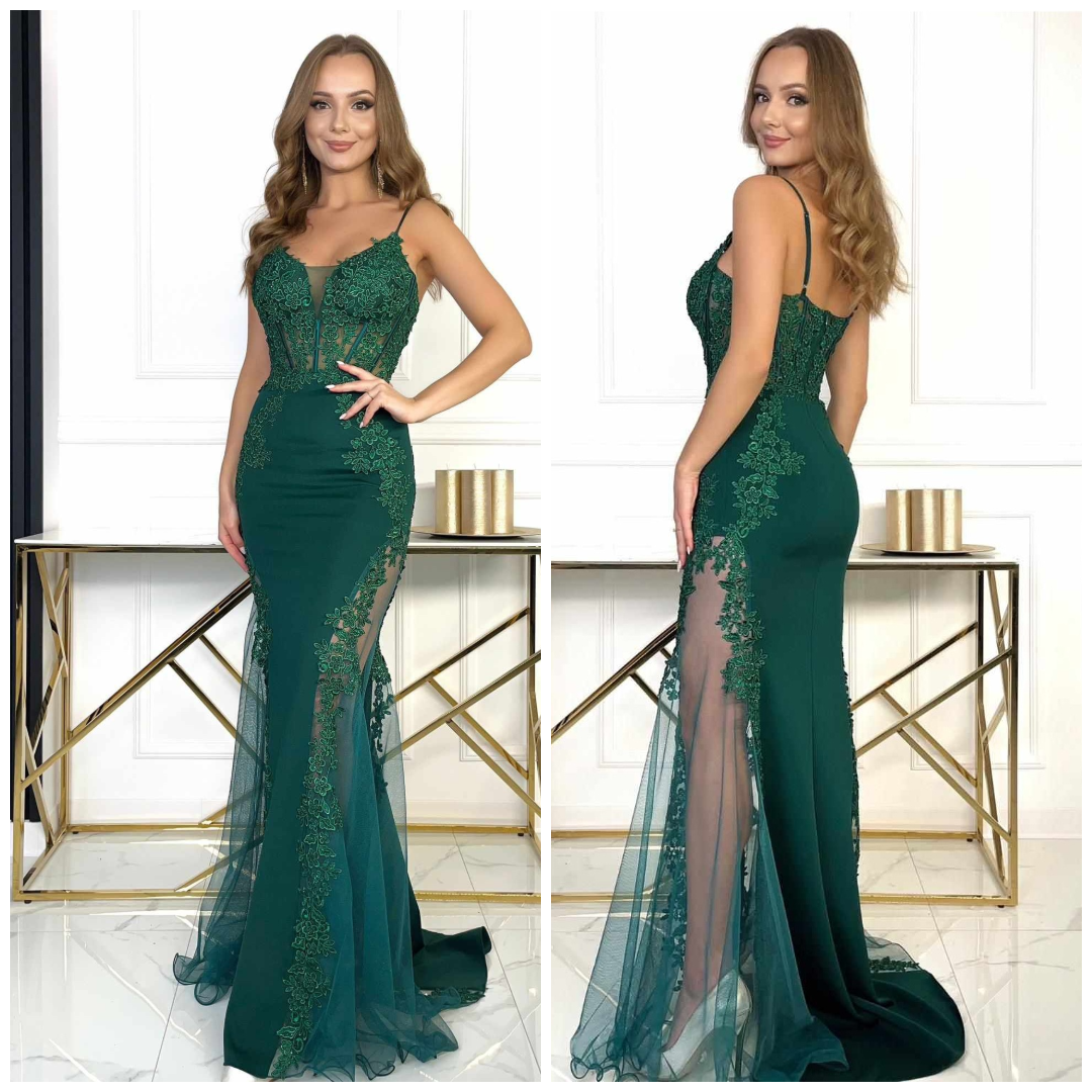 Wyjątkowa suknia na ramiączkach o nazwie „Boda” w kolorze zielonym. Jej zjawiskowy design skradnie serca wszystkich gości. Góra sukni zachwyca oryginalną koronką w formie szpicu, wykonaną z delikatnej siateczki obszytej misternie gipiurowymi kwiatowymi wzorami, zdobionymi koralikami. To połączenie sprawia, że suknia prezentuje się niezwykle zmysłowo i niepowtarzalnie