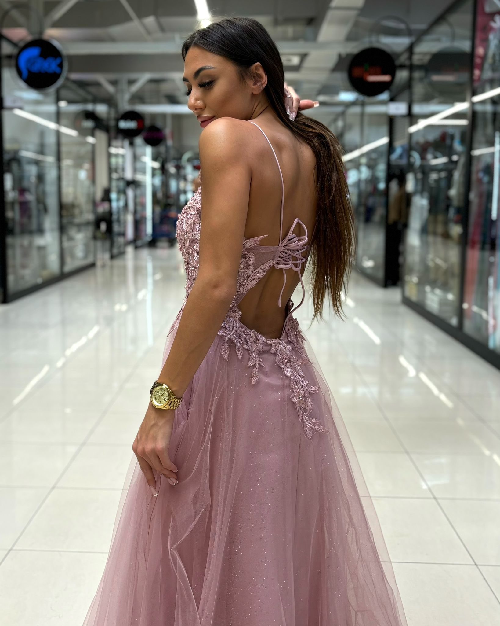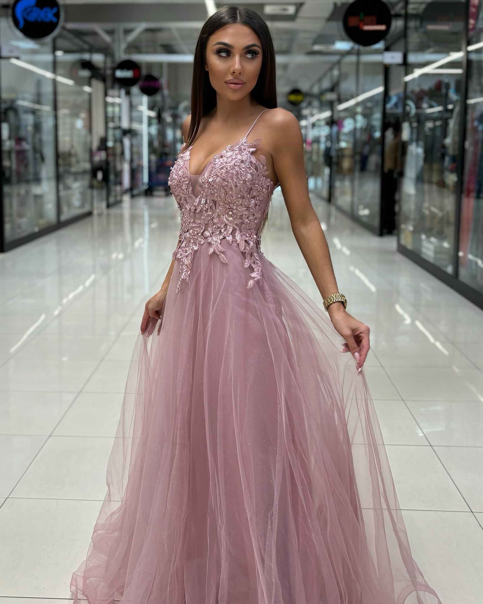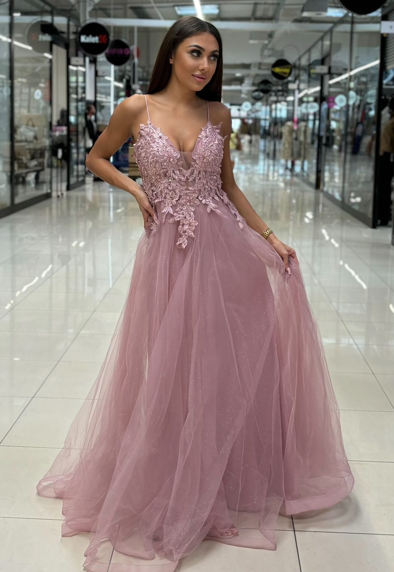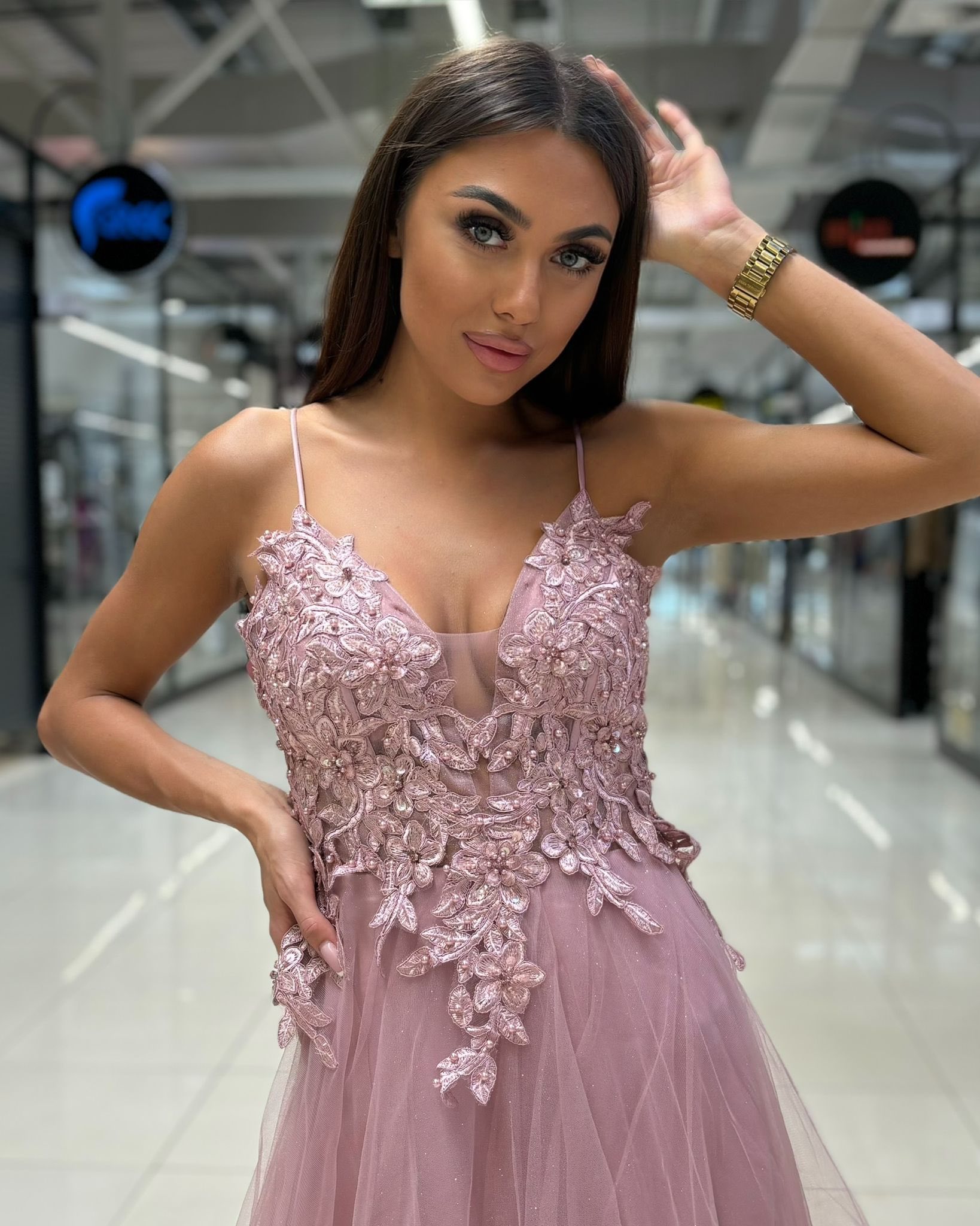Gorsetowa góra zdobiona została haftem 3D oraz subtelnymi aplikacjami, które dodają blasku i elegancji. Dekolt w kształcie litery V optycznie wysmukla sylwetkę i podkreśla kobiece kształty. Sukienka posiada cienkie ramiączka oraz wiązanie z tyłu, które pozwala na idealne dopasowanie do figury.