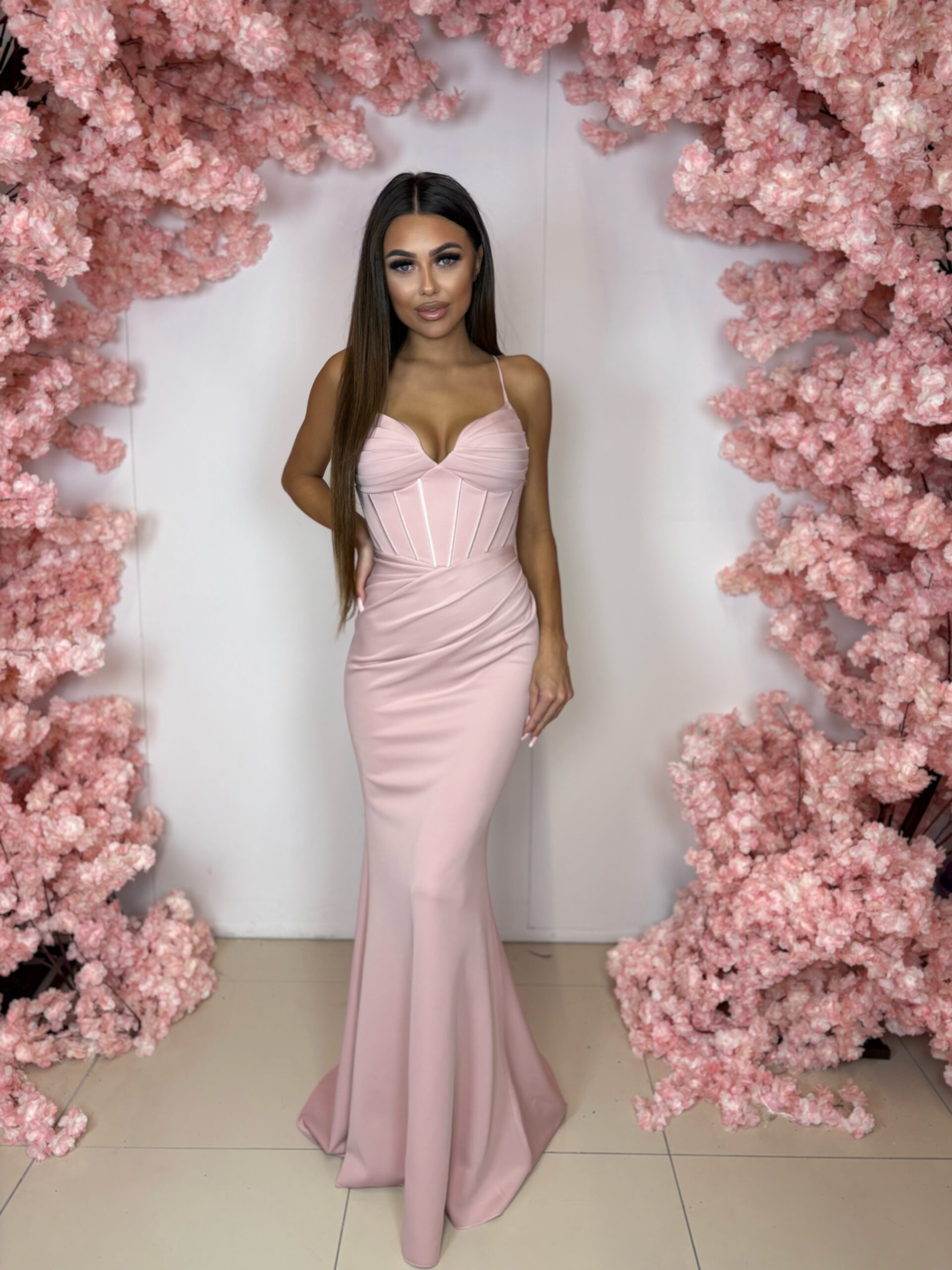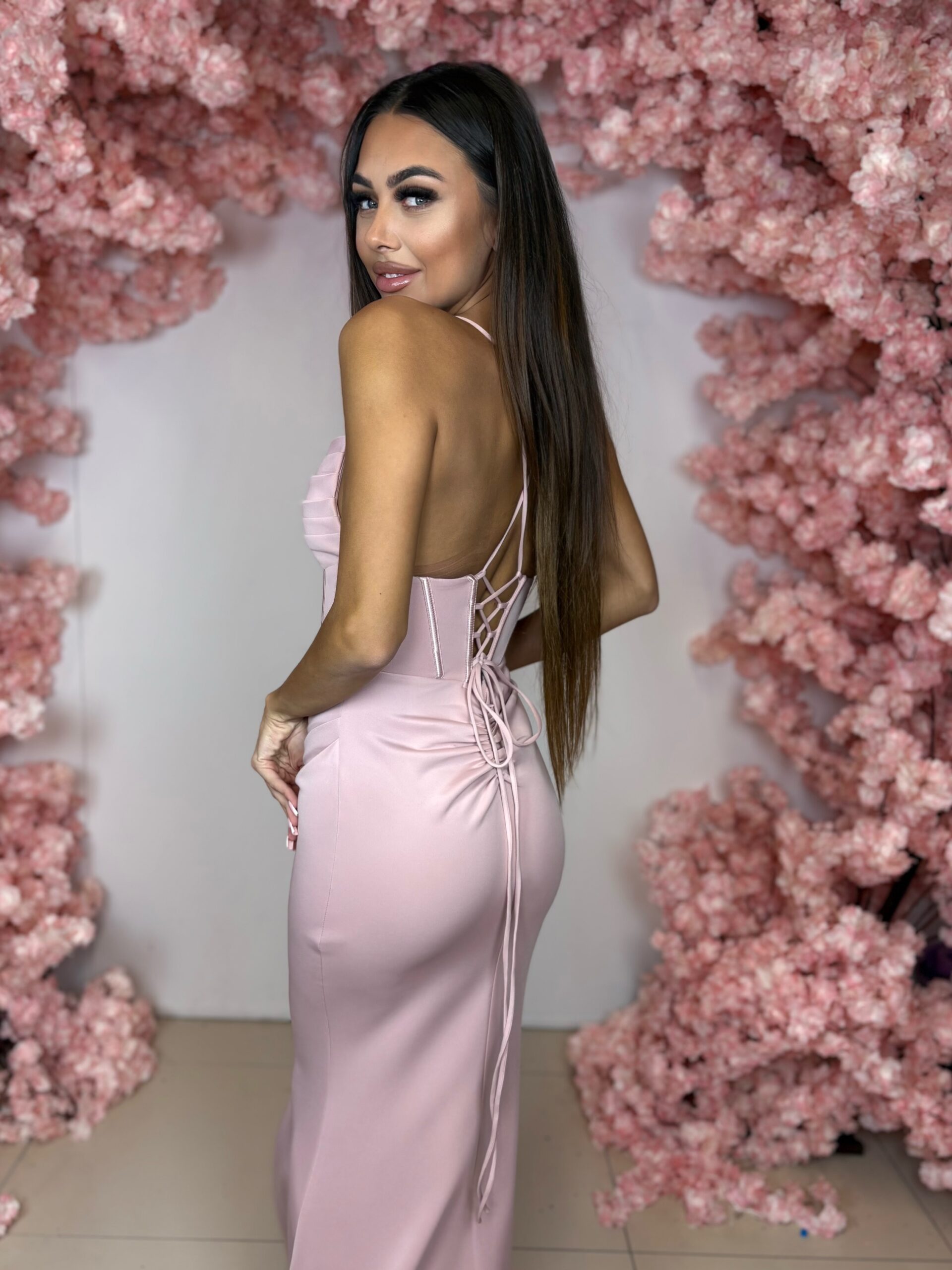 Elegancka długa sukienka wieczorowa w odcieniu pudrowego różu to idealna propozycja dla kobiet, które szukają wyjątkowej kreacji na specjalne okazje. Ta dopasowana sukienka maxi o kroju syrenki pięknie podkreśla sylwetkę, modeluje talię oraz eksponuje kobiece kształty, zapewniając efekt glamour.