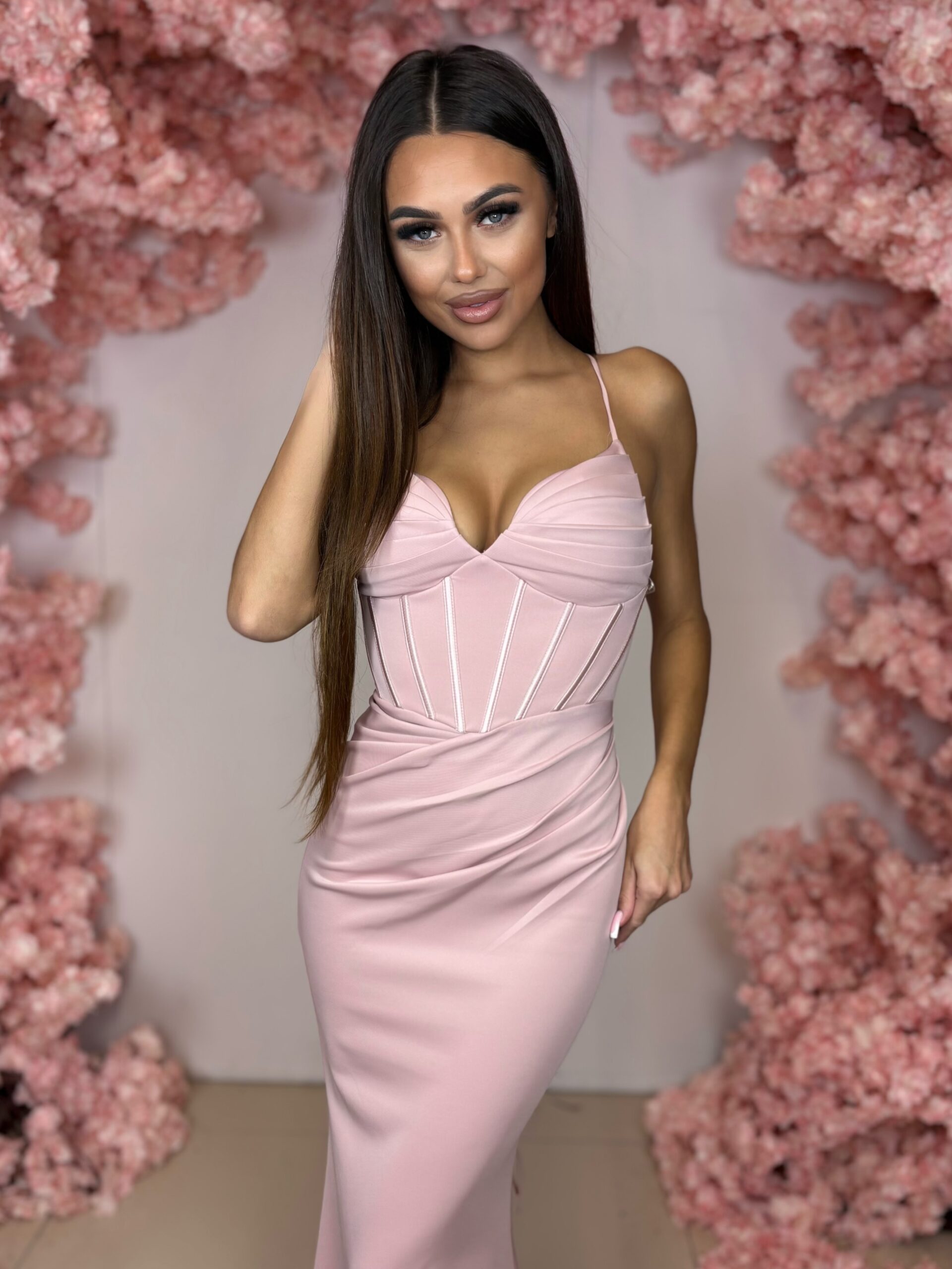 Góra sukienki to efektowny, usztywniany gorsetowa sukienka maxi z subtelnymi przeszyciami wysmuklającymi talię. Marszczony biust i kobiecy dekolt w kształcie serca sprawiają, że jest to idealna sukienka na wesele, sukienka na bal oraz eleganckie przyjęcia. Cienkie ramiączka dodają lekkości i subtelnego charakteru.