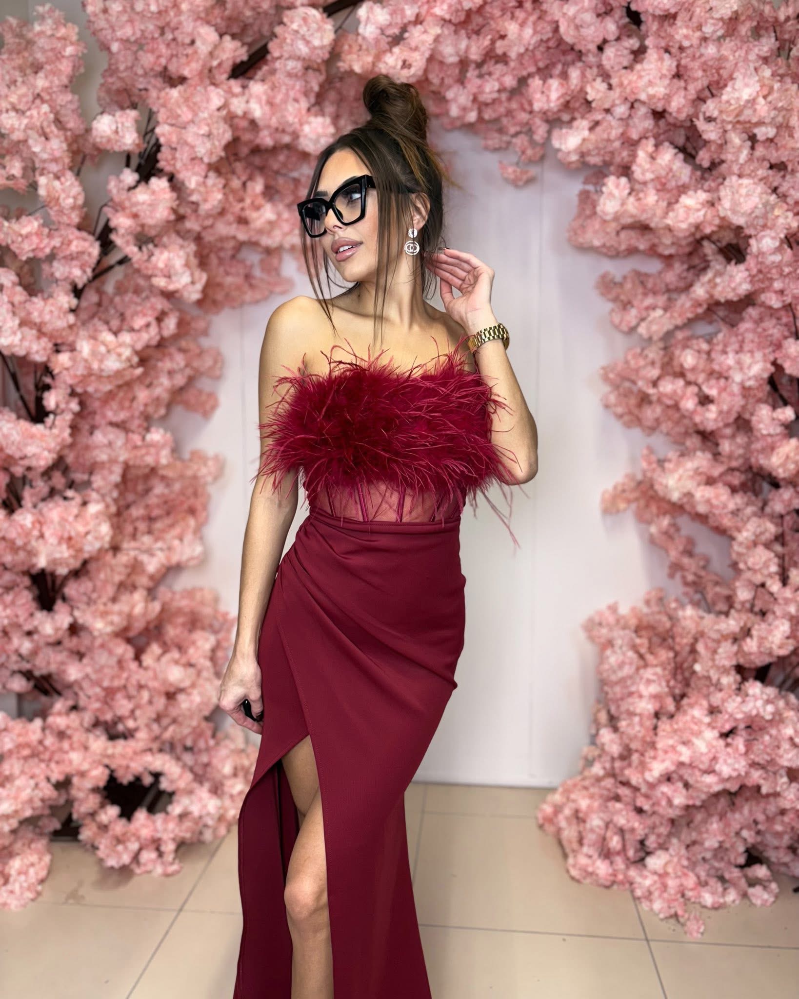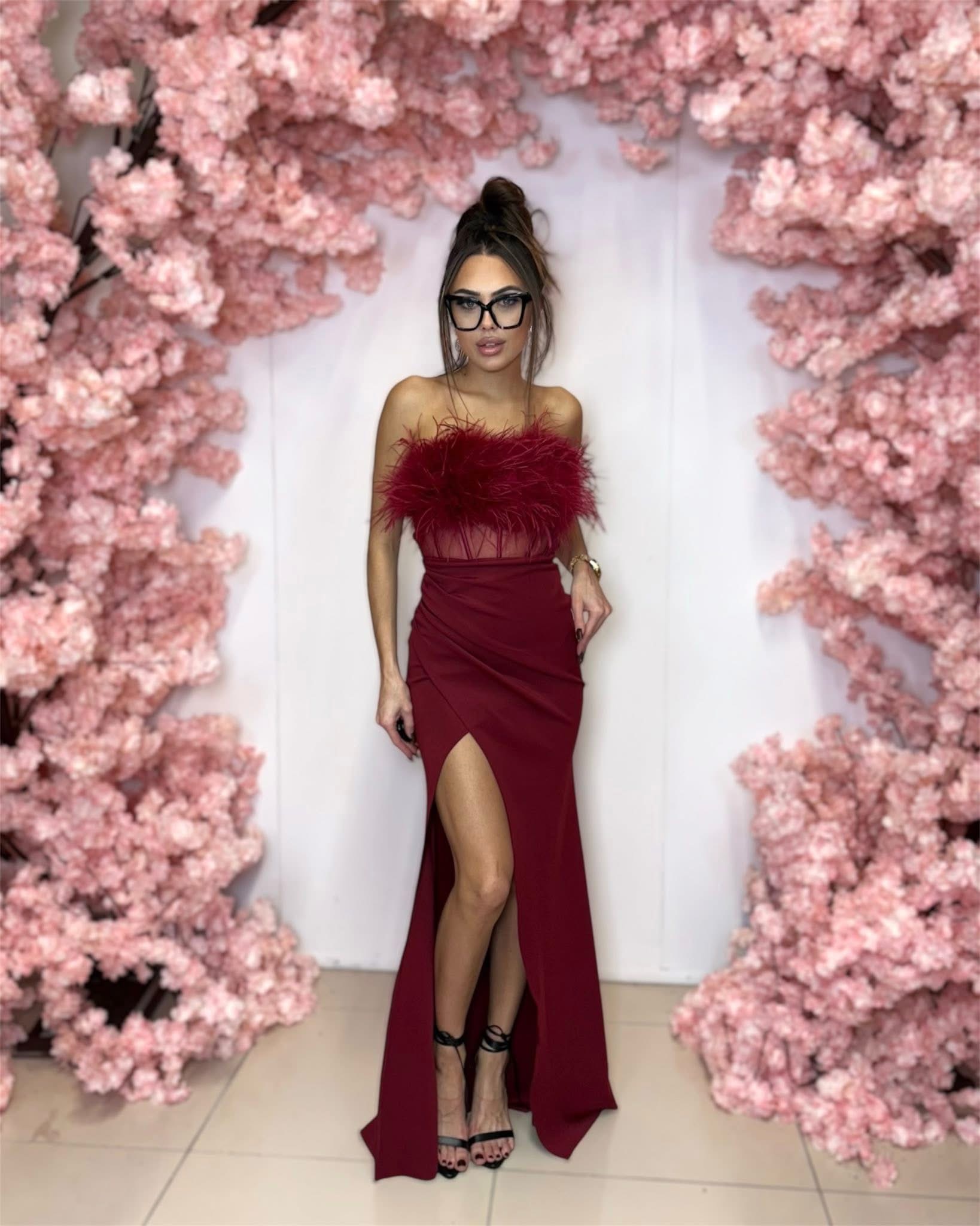 Bordowa długa sukienka gorsetowa z piórami