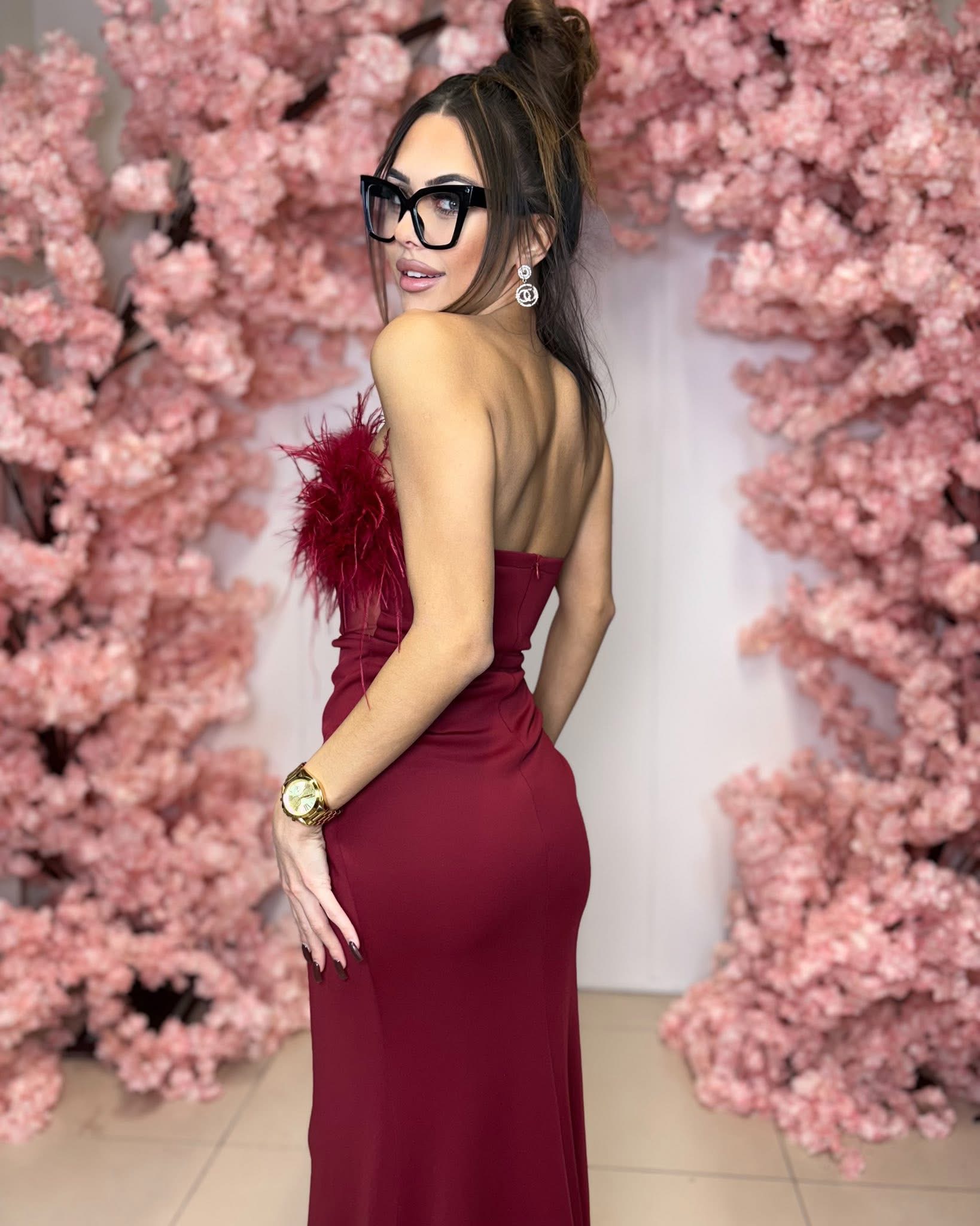 Ta wyjątkowa sukienka maxi to połączenie klasycznej elegancji i odważnego, zmysłowego stylu. Gorsetowa góra bez ramiączek została ozdobiona efektownymi piórami, które dodają kreacji luksusowego i niepowtarzalnego charakteru. Sukienka pięknie eksponuje ramiona i podkreśla kobiecą sylwetkę.
