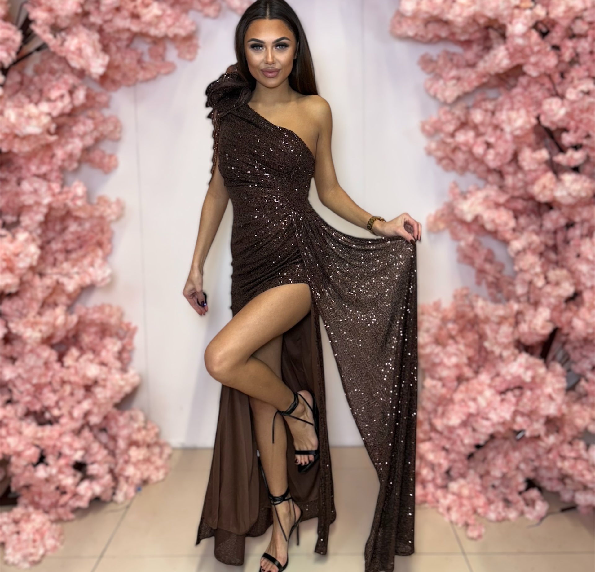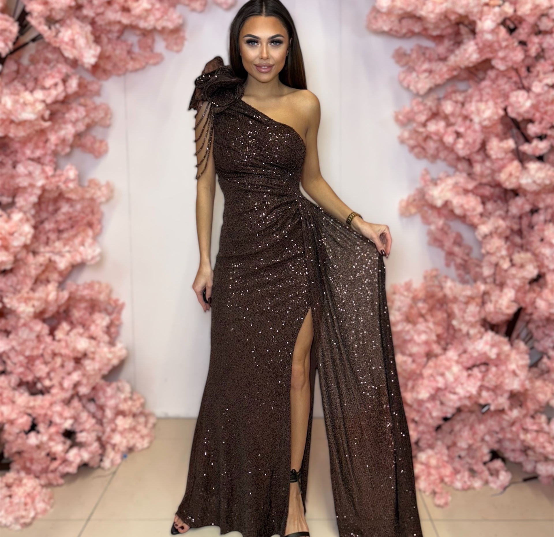 Napisz pierwszą opinię o „Ivy długa czekoladowa cekinowa sukienka z rozporkiem”