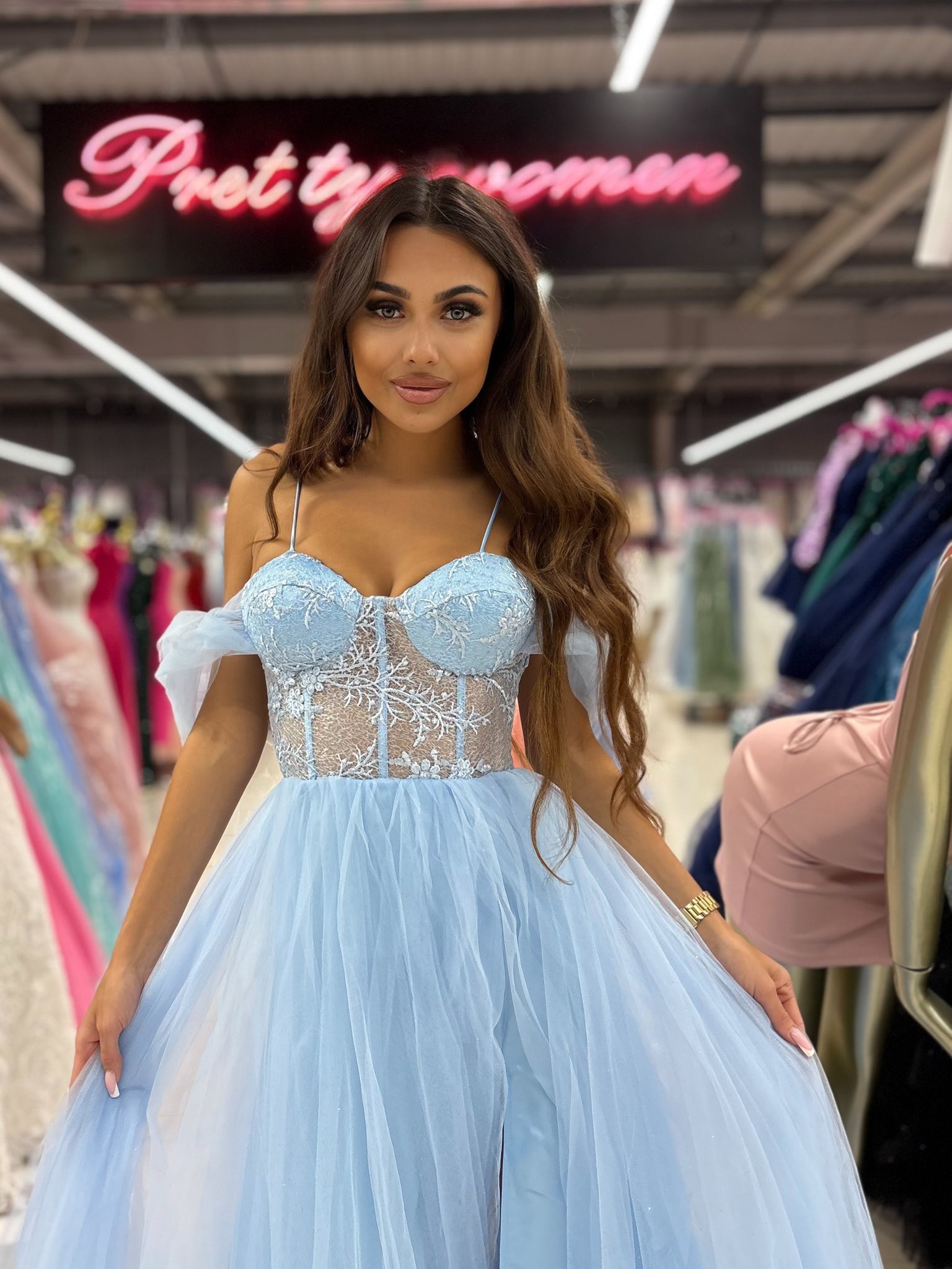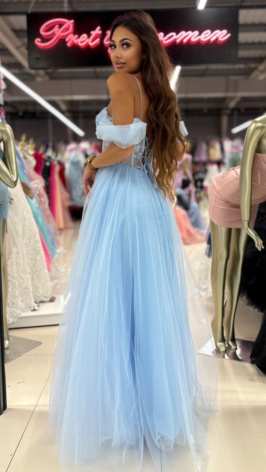 Dolna część sukni wykonana jest z kilku warstw lekkiego tiulu, który delikatnie unosząc się, nadaje sukni lekkości i zwiewności. Sukienka Lyanna została wyposażona w wszyte miseczki z przodu, co eliminuje potrzebę noszenia biustonosza.