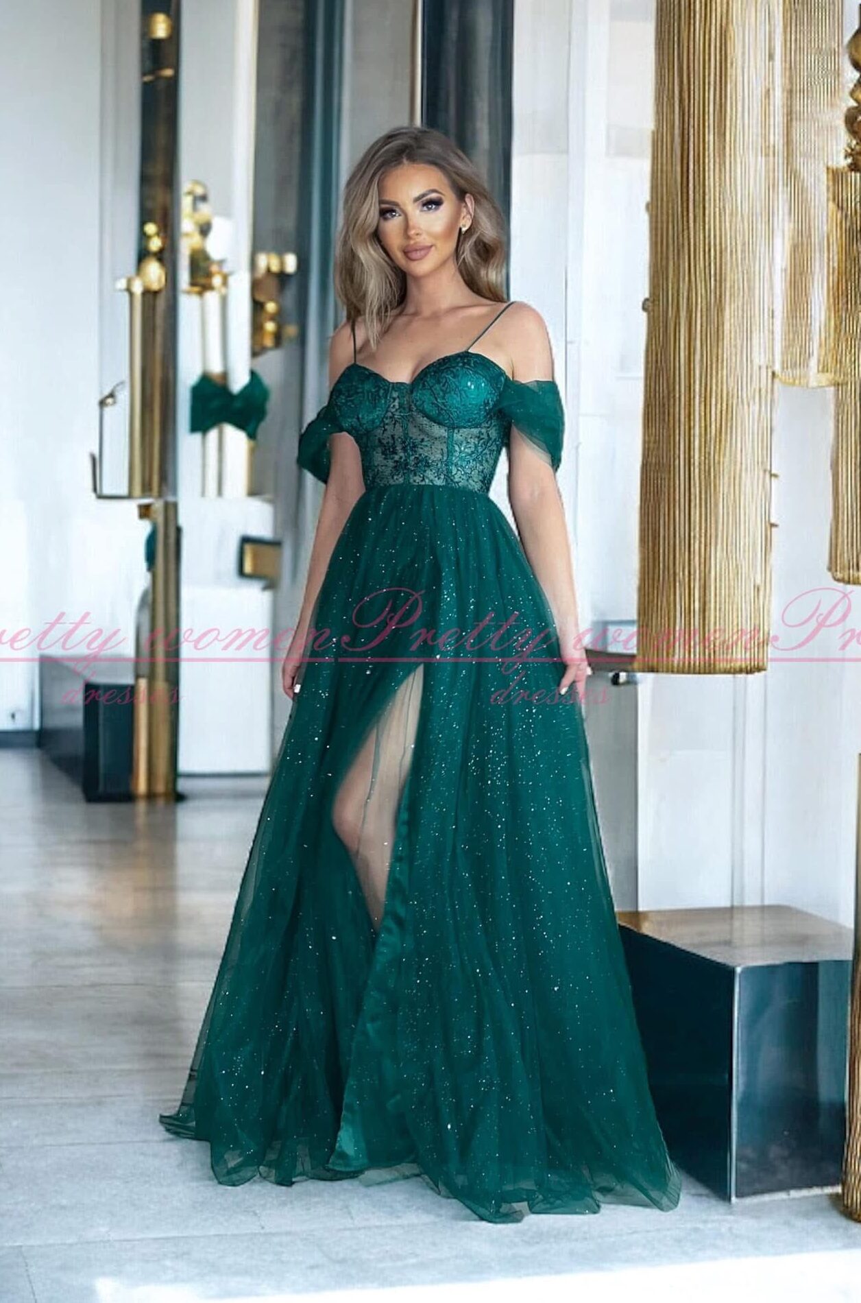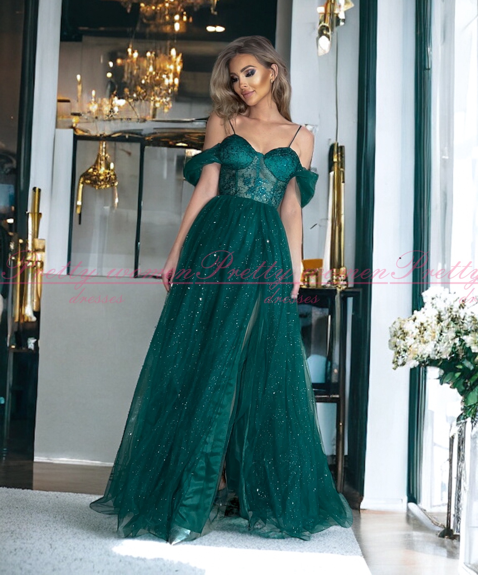 Cudowna wieczorowa sukienka na wyjątkowe okazje. Góra sukienki ozdobiona gipiury. Dół zwiewny.