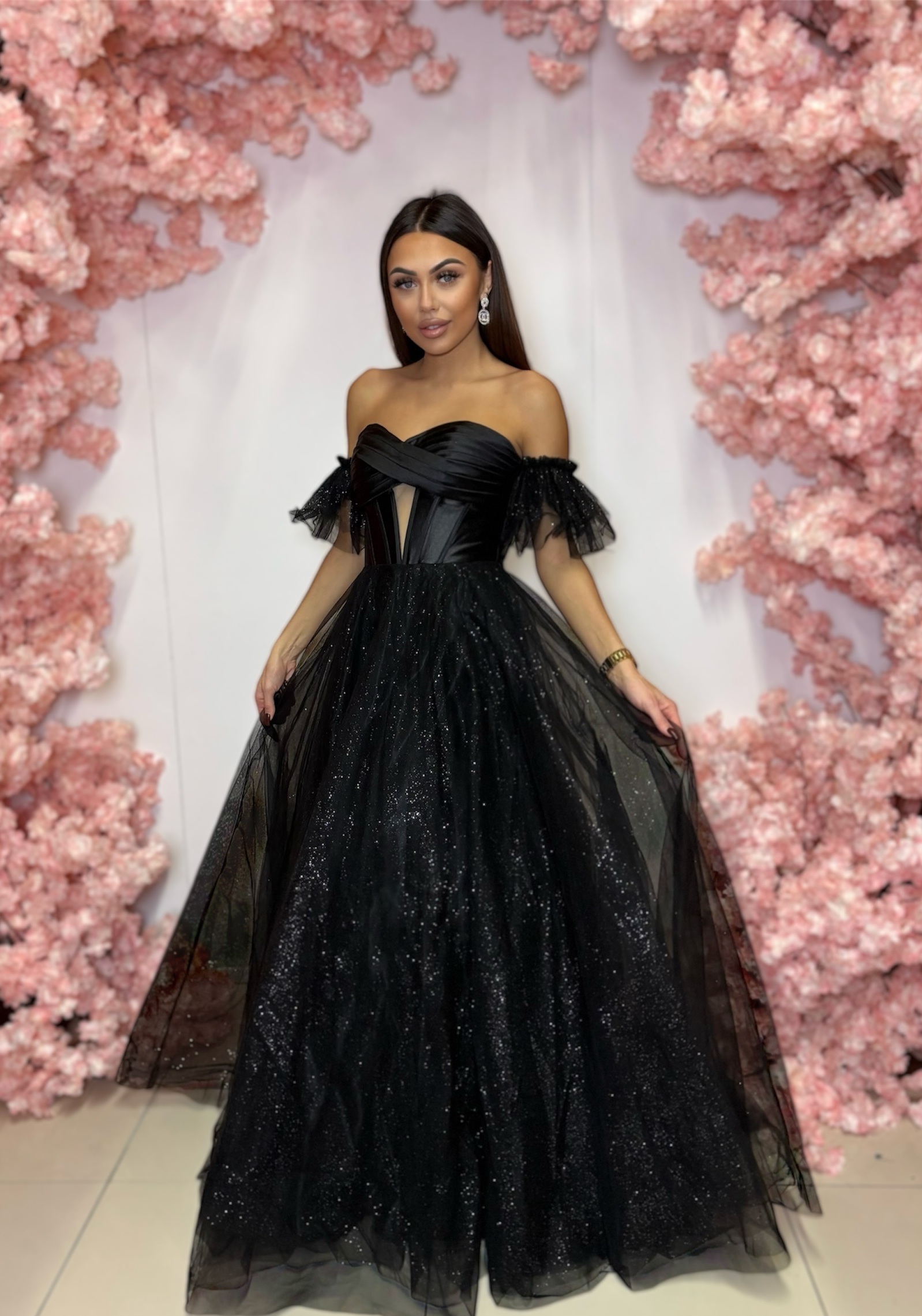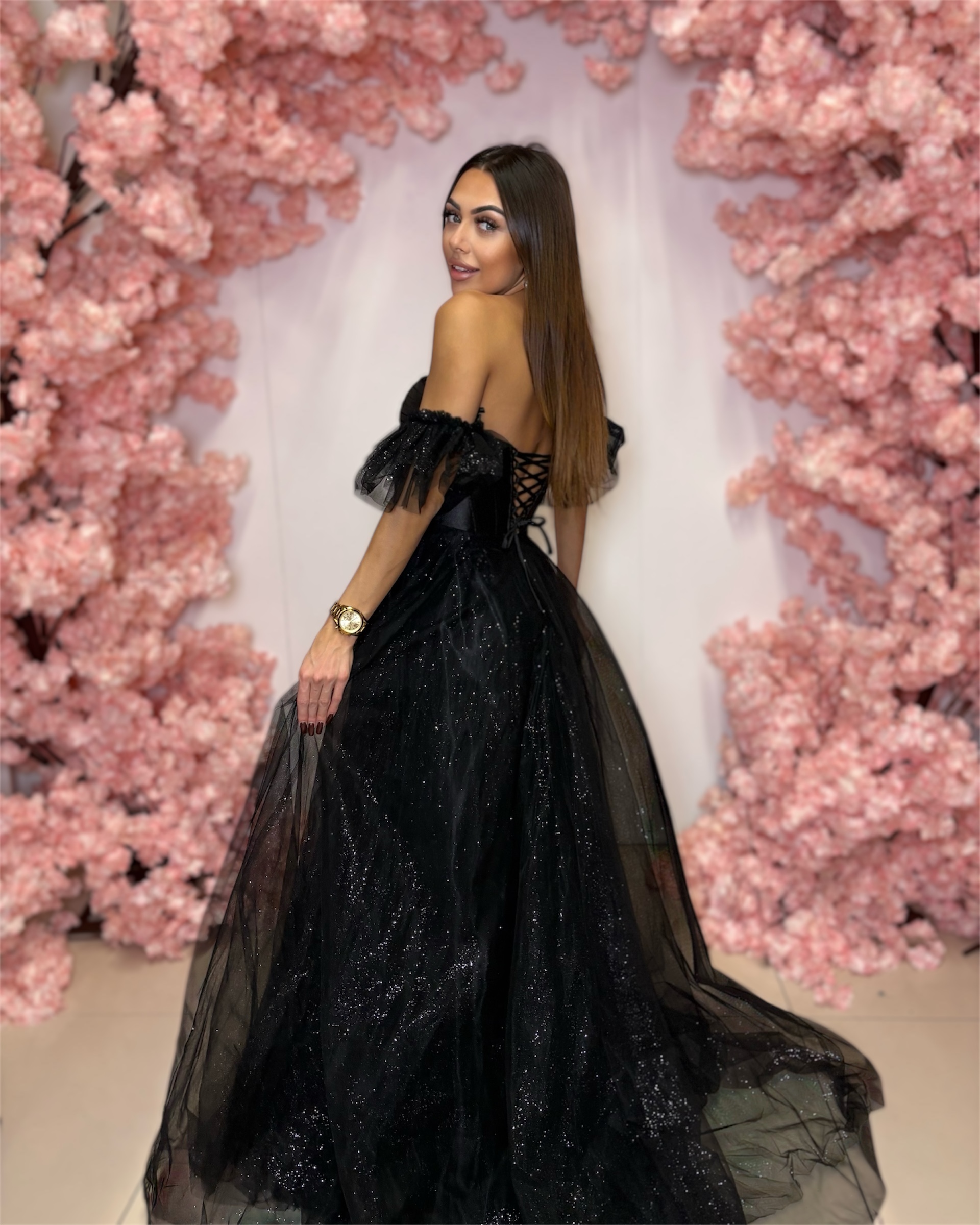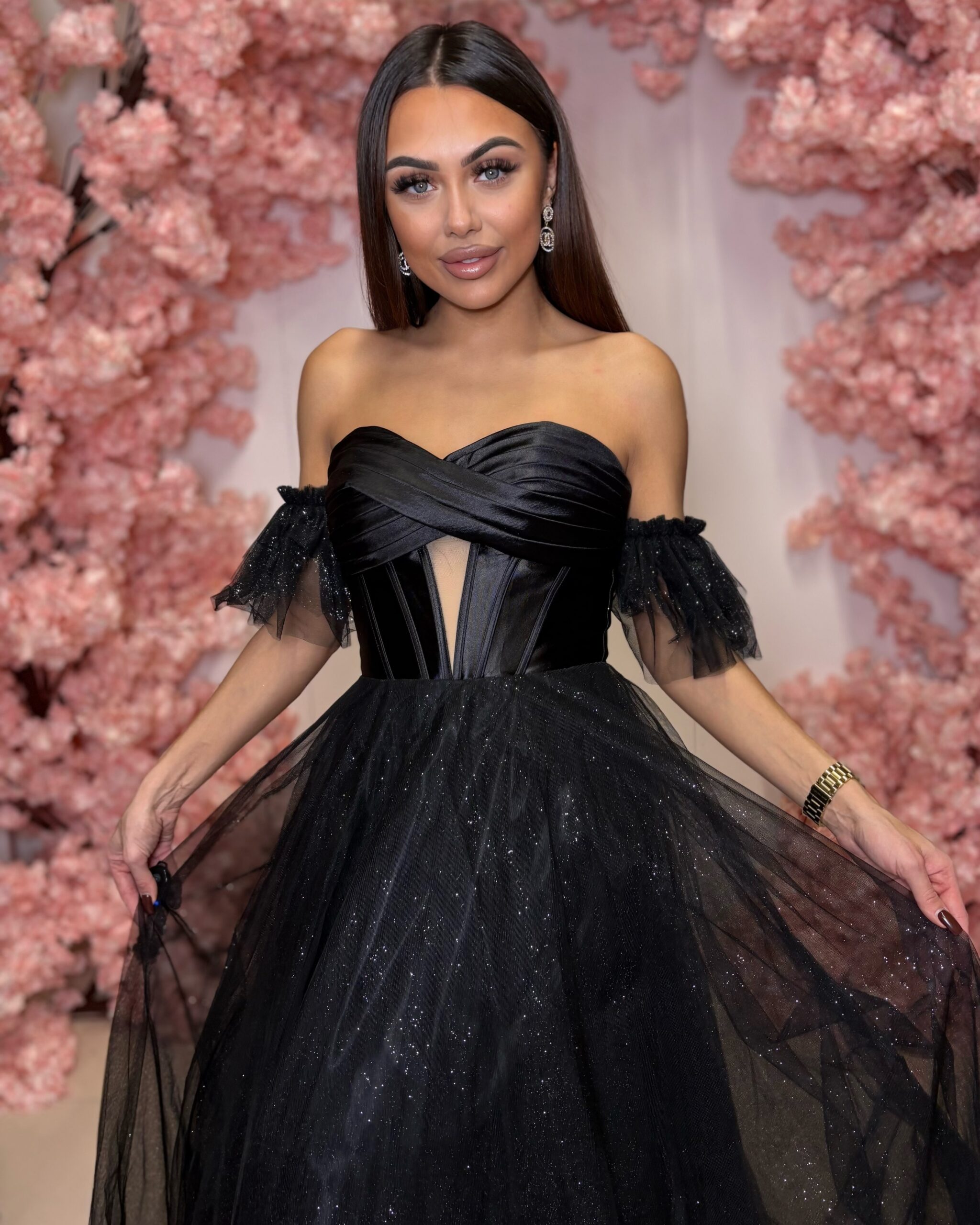 Sukienka Ortis to zjawiskowa czarna sukienka maxi z tiulu, idealna na wyjątkowe uroczystości. Doskonale sprawdzi się jako sukienka na wesele, studniówkę, bal, galę czy eleganckie przyjęcie, zachwycając ponadczasową elegancją i subtelnym charakterem.