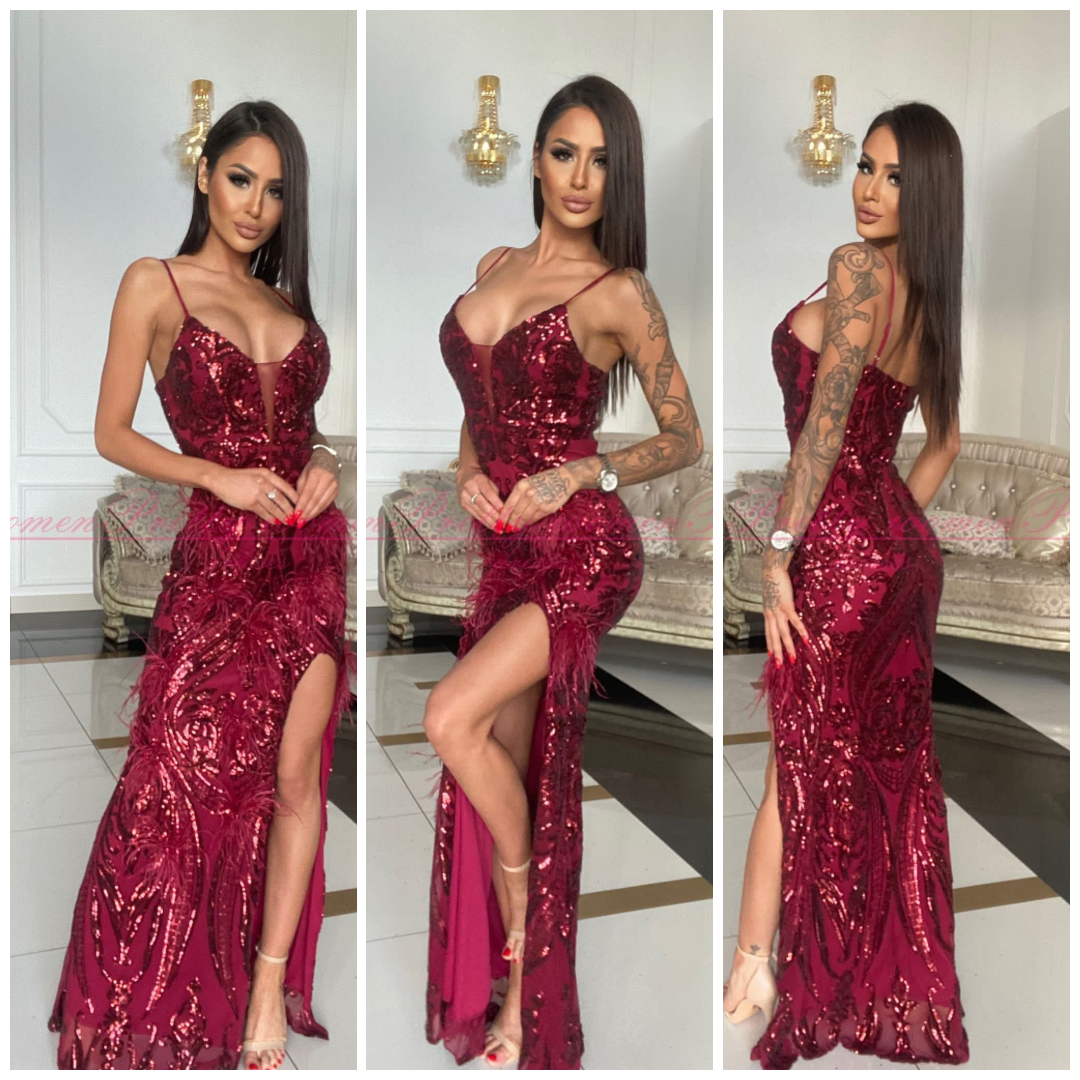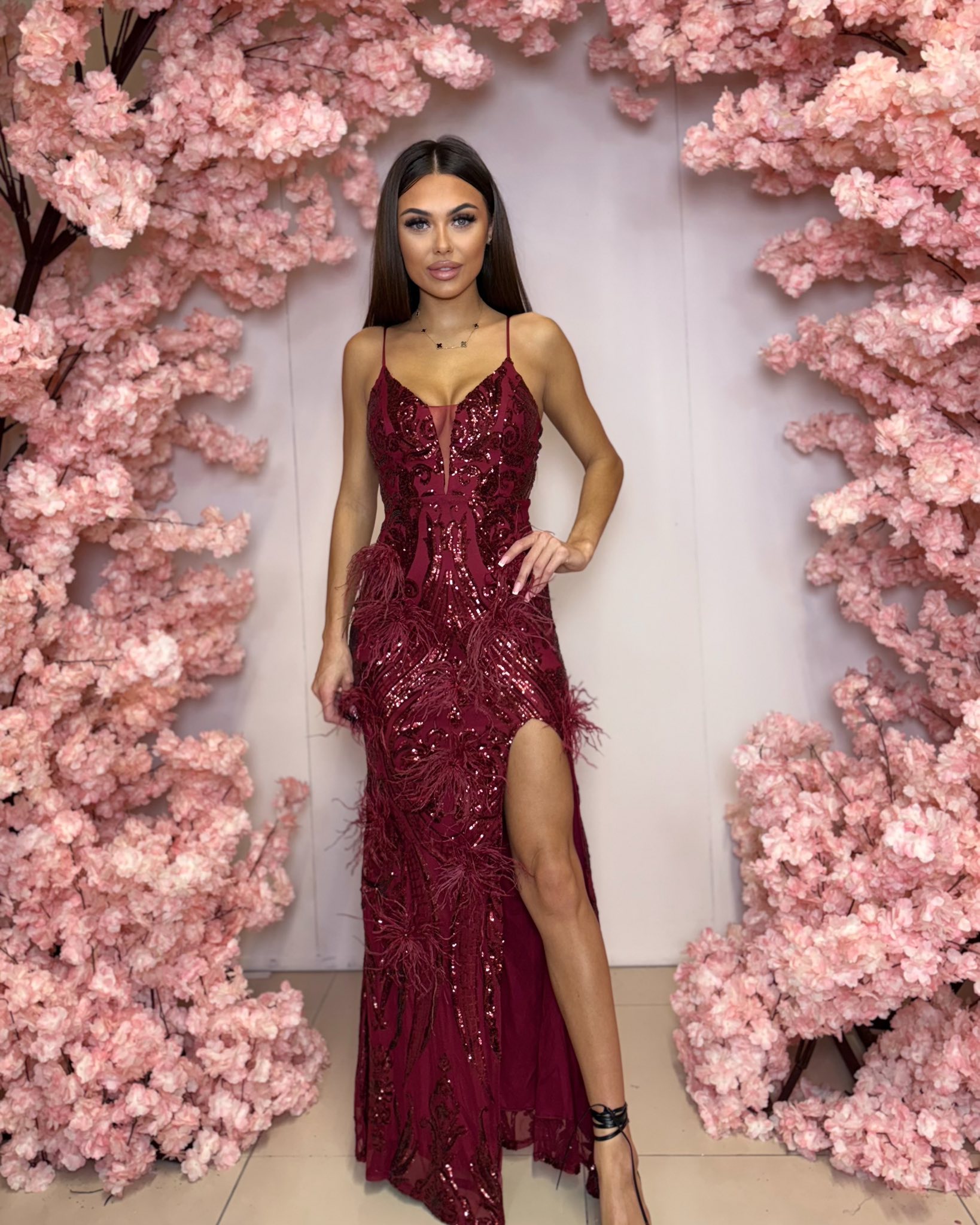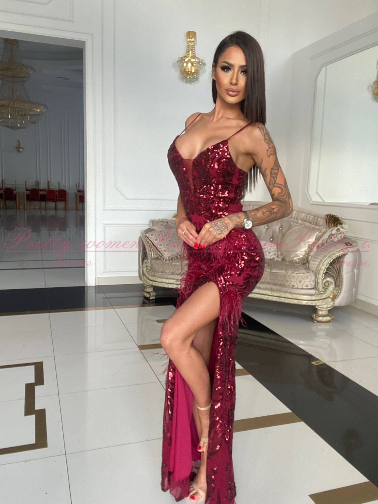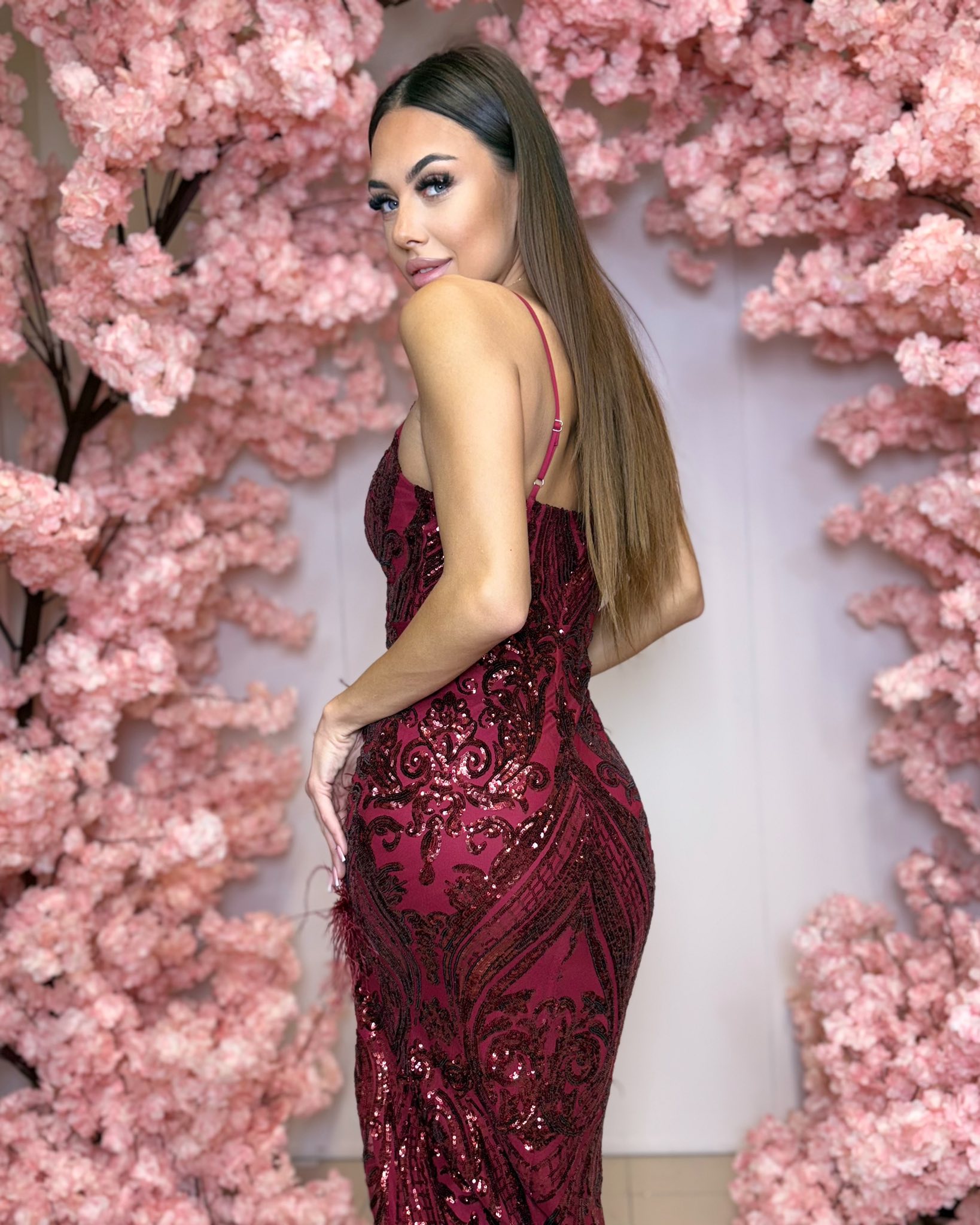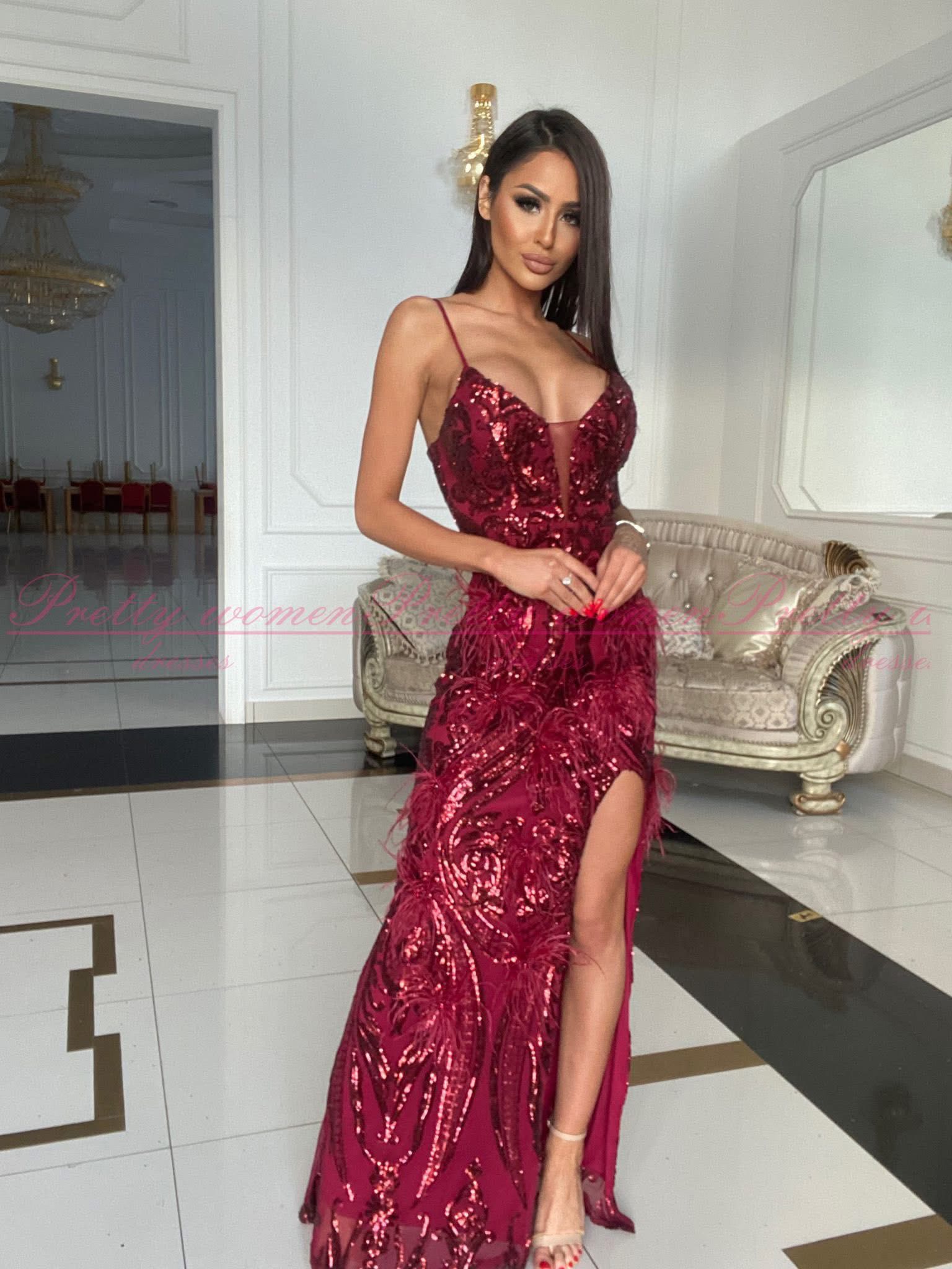 SKU: Pusia-7 AVAILABILITY:Ta długa suknia wieczorowa, wyróżnia się nie tylko swoim wyglądem, ale także stylem. Jest ona zdobiona niezliczonymi cekinami i subtelnie umieszczonymi piórkami, które nadają jej niepowtarzalny, wyjątkowy charakter. To kreacja, która nie tylko podkreśla kobiece kształty, ale także emanuje pewnym urokiem.