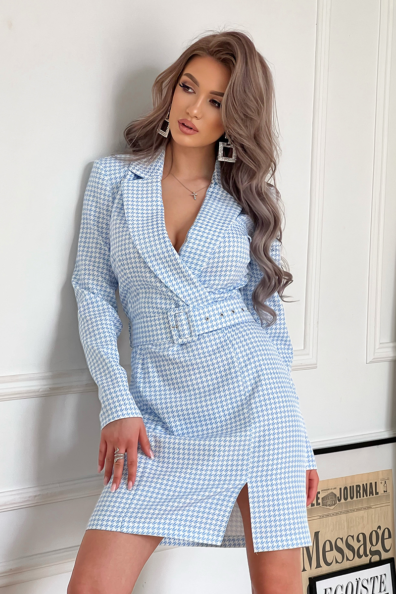 Ta elegancka sukienka marynarkowa z modnym wzorem pepitki to doskonały wybór dla kobiet ceniących klasykę i nowoczesny szyk. Taliowany fason, podkreślony ozdobnym paskiem z klamerką, pięknie modeluje sylwetkę i nadaje całości wyrazistego charakteru.