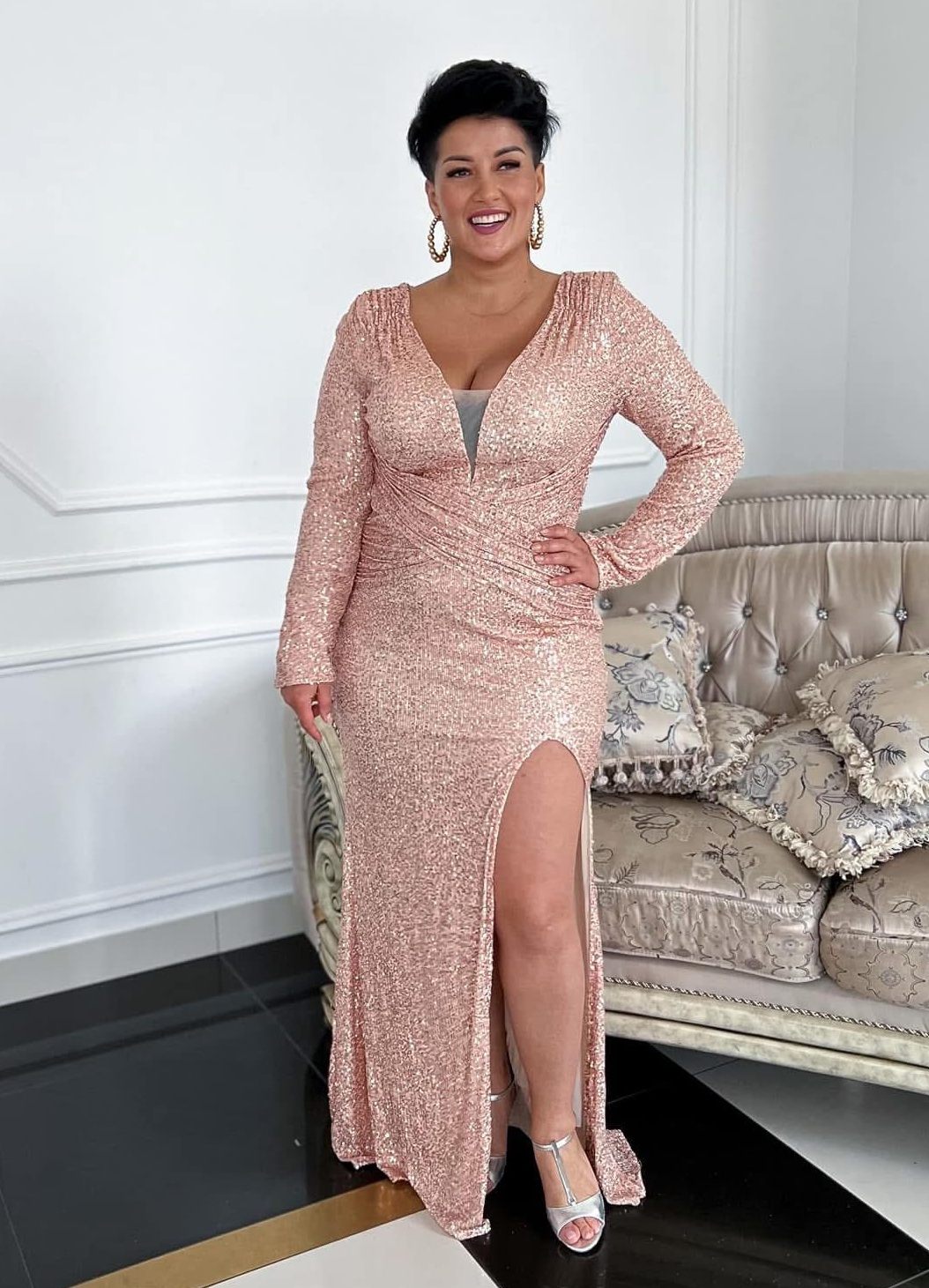SKU: Tequilla rękaw złota AVAILABILITY:Cudowna wieczorowa sukienka na wyjątkowe okazje, w kolorze srebrno-beżowym (srebrne cekiny na bezowym materiale) Długa i mieniąca w stylu glamour . Uszyta jest z z elastycznego materiału. Na plecach znajduje się się niewielki dekolt w kształcie litery „V” oraz zamek ułatwiający zakładanie. Modelka ma 170cm wzrostu