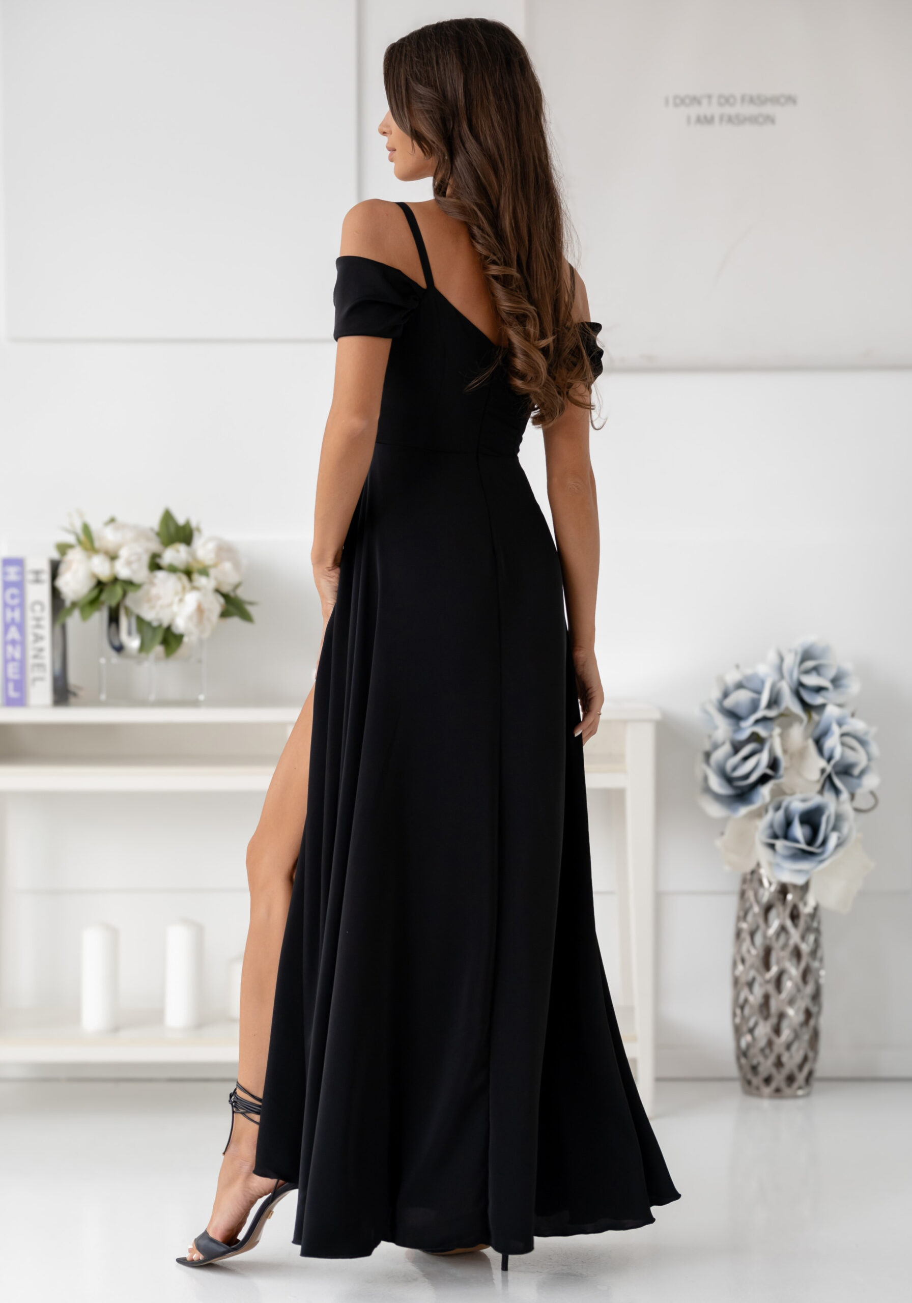 Sukienka posiada cienkie ramiączka, które zapewniają wygodne podtrzymanie, oraz rozkloszowany dół z efektownym rozporkiem, który dodaje lekkości i wdzięku. Wykonana z delikatnego, zwiewnego materiału, doskonale układa się na sylwetce i zapewnia komfort noszenia. Zapięcie na kryty zamek z tyłu sprawia, że sukienka perfekcyjnie dopasowuje się do figury, podkreślając jej atuty.